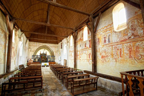 Et nous passerons également dans un tout petit village qui a une magnifique église du Xᵉ siècle, l’Église Saint-Pierre-et-Saint-Paul de Moutiers-en-Puisaye. Cette église est remarquable par ses peintures murales médiévales réalisées entre le XIIe siècle et le XVe siècle, décrivant des scènes bibliques.